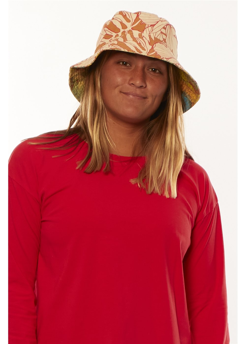 PRINTED CANVAS BUCKET HAT THAT IS REVERSABLE. SHE HAS TRAPUNTO STITCHING AROUND HE BRIM.