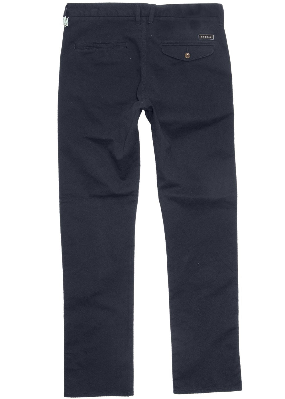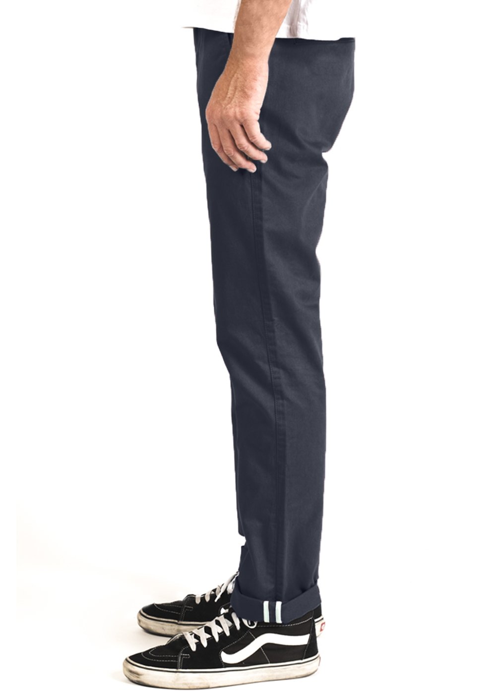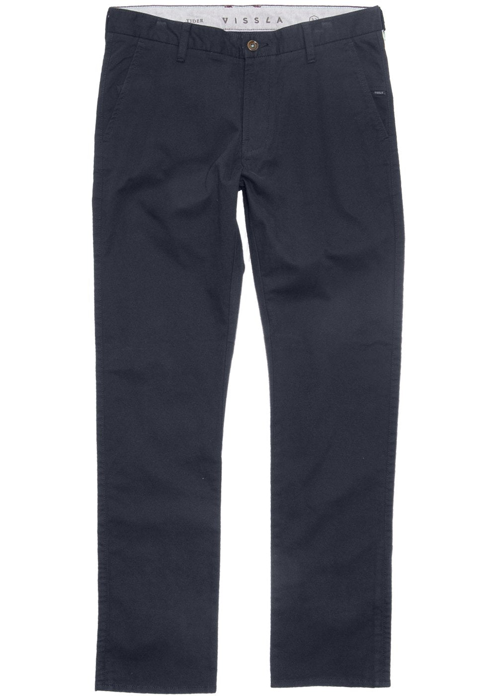 An original everyday chino pant made with twilled organic cotton and spandex, for a sleek look with subtle flex. The Low Tide Eco pant is styled with a 15" leg opening, contrast chambray at waistband facing, slash hand pockets and back pockets. Vissla woven labels. 32" Inseam.